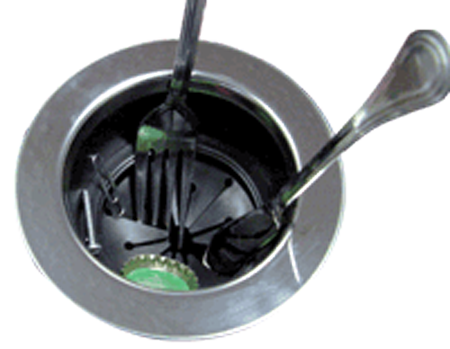 | Magnetický strážce zachytí většinu příborů a kovových předmětů před sklouznutím z dřezu do drtiče odpadu. Ochrání drtící prvky uvnitř drtiče před poškozením. Zachycené příbory jsou ochráněny před poškozením způsobeným drtičem odpadu. Nezachytí předměty, které jsou do drtičky vhozeny, nebo spadnou z výšky. |